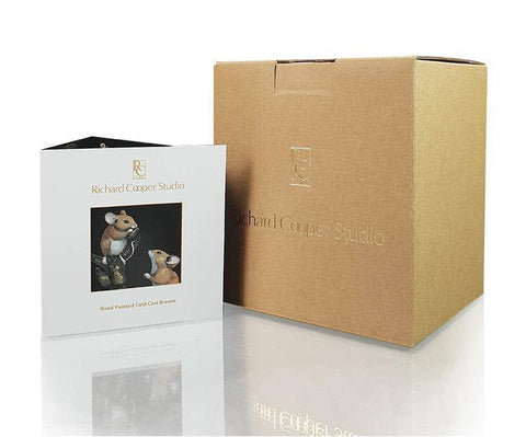 This charming little mouse holding a penny fathering, sculpted by Michael Simpson. Cast in bronze resin, the little mouse has been delicately hand painted highlighting thedetails and delicate features of this super little mouse.