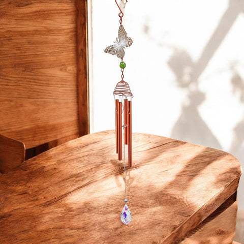 Elevate your outdoor ambiance with the Rose Gold Butterfly Wind Chime. Crafted with precision, its finish and delicate butterfly design create a sophisticated visual appeal. The chime produces gentle, harmonious tones that enhance relaxation and add a refined touch to gardens, patios, or balconies. Durable and weather-resistant, it combines aesthetic elegance with lasting performance for an expert choice in decorative wind chimes. Size: 58cm x 8cm x 6cm